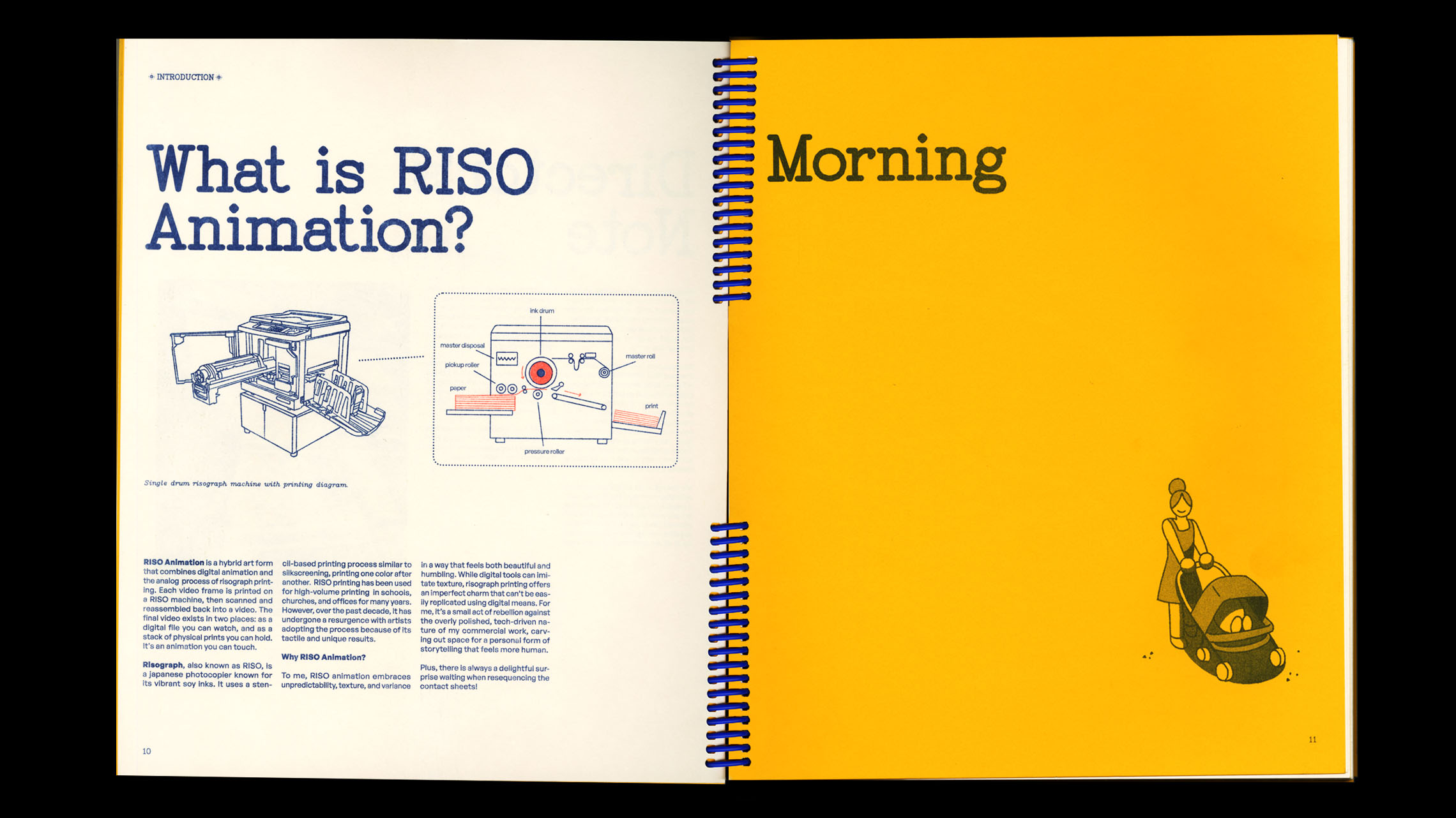 Whereabouts is an art book that acts as a companion to the eponymous riso-animated short film. Divided into 3 chapters: Morning, Noon, and Dusk, the book traces the filmmaking process from start to finish, with each section showcasing selected frames that mirror the time of the day.